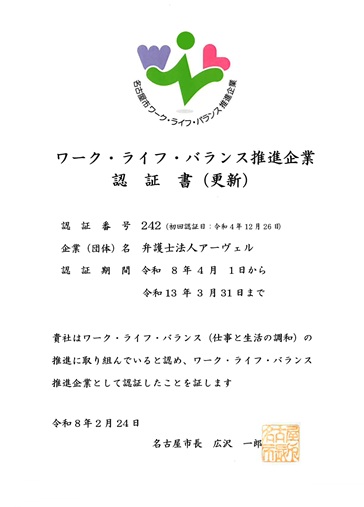 また、「名古屋市ワーク・ライフ・バランス推進企業」認証も更新されました。